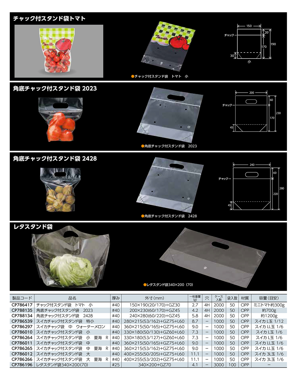 生鮮野菜や青果物の袋として最適。 両面防曇加工により、曇りを防止して内容物を鮮明に見せることができます。