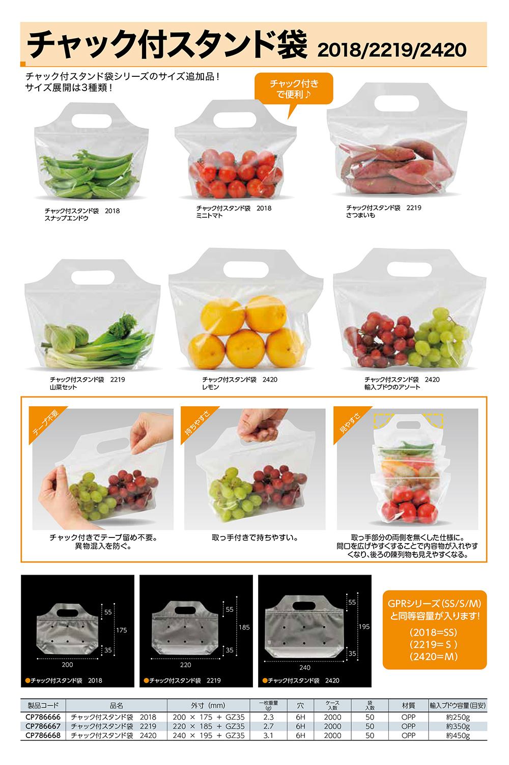 青果物の立体陳列などに最適な透明手提げ袋です。 取っ手穴付で持ちやすく重量物にも安心して使用できます。