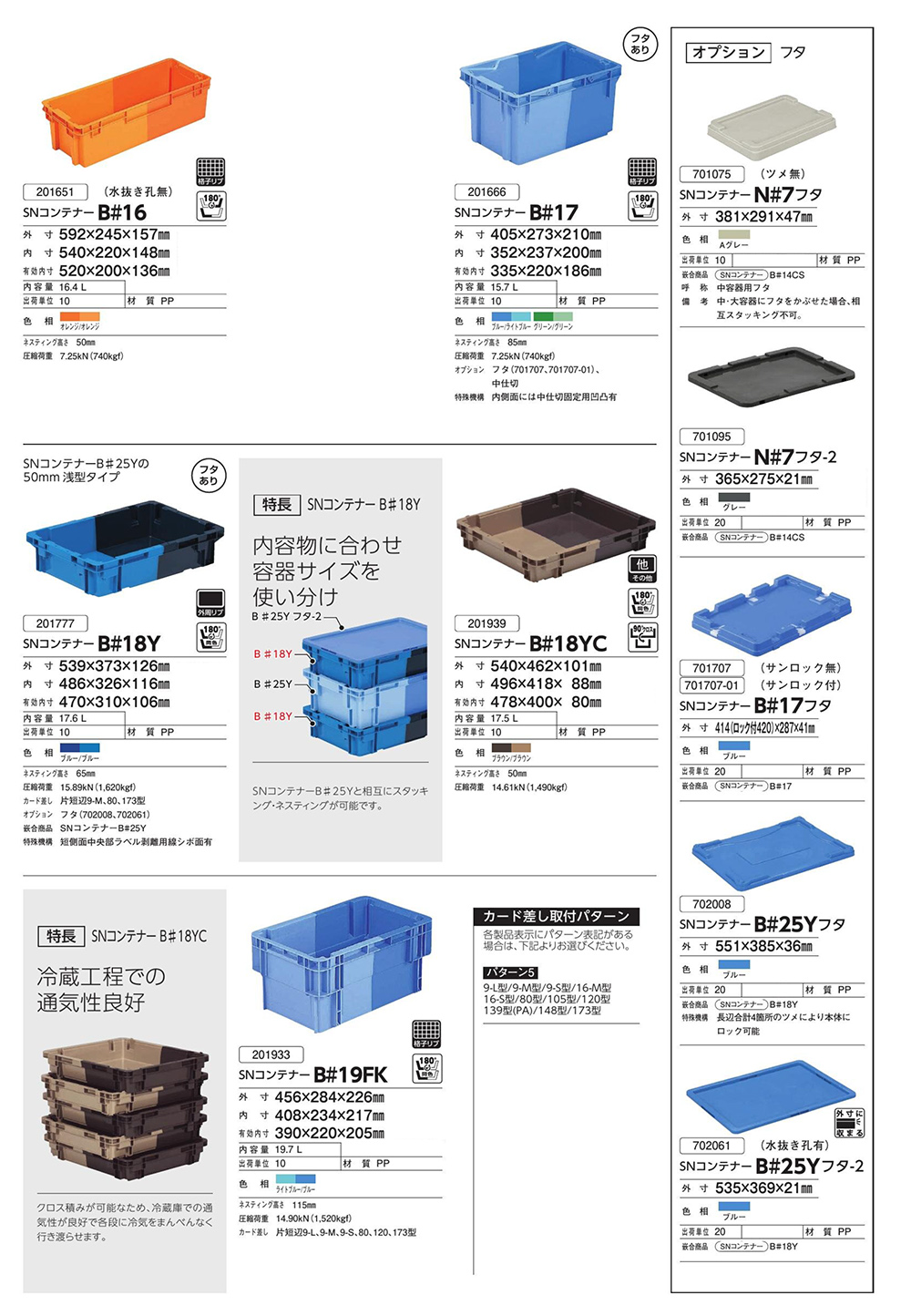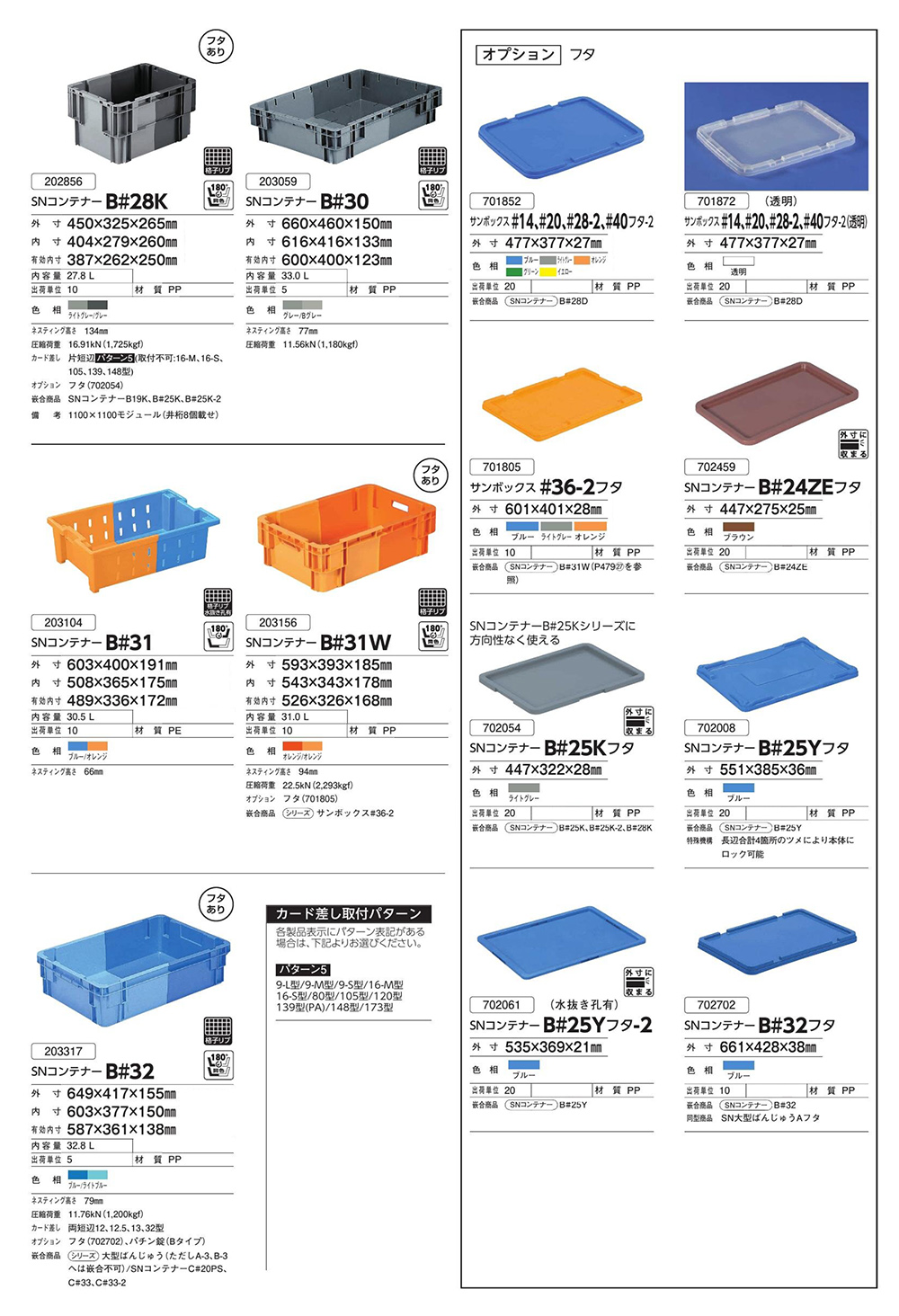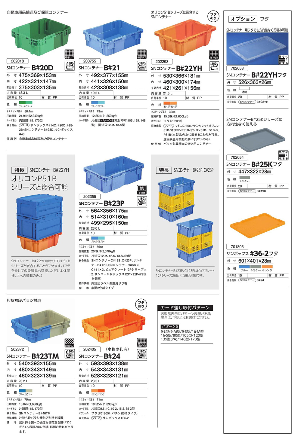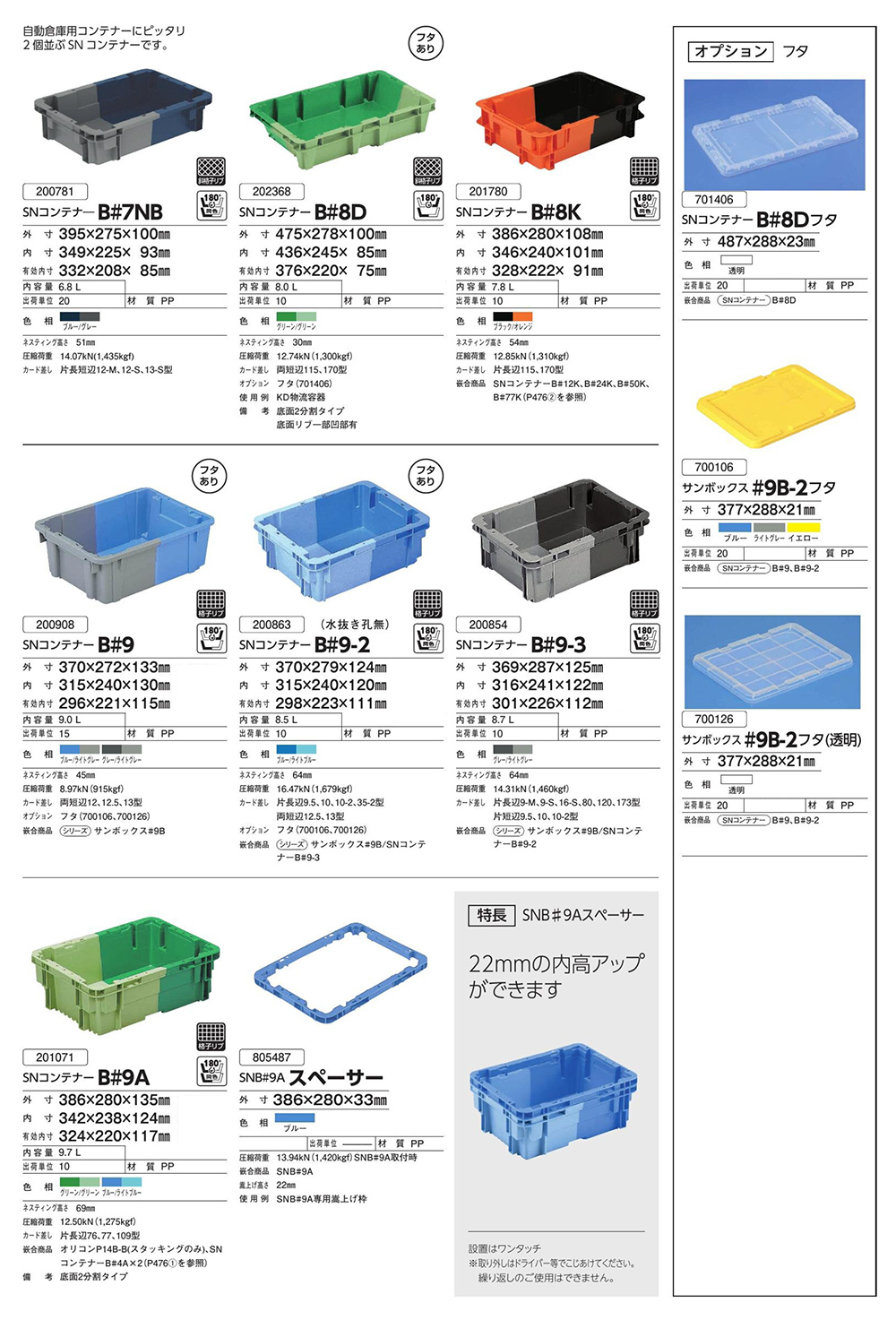 保管スペースと返送コストを削減する「ネスティング効率追求型」と段積み強度に優れた「耐荷重性強化タイプ」があります。