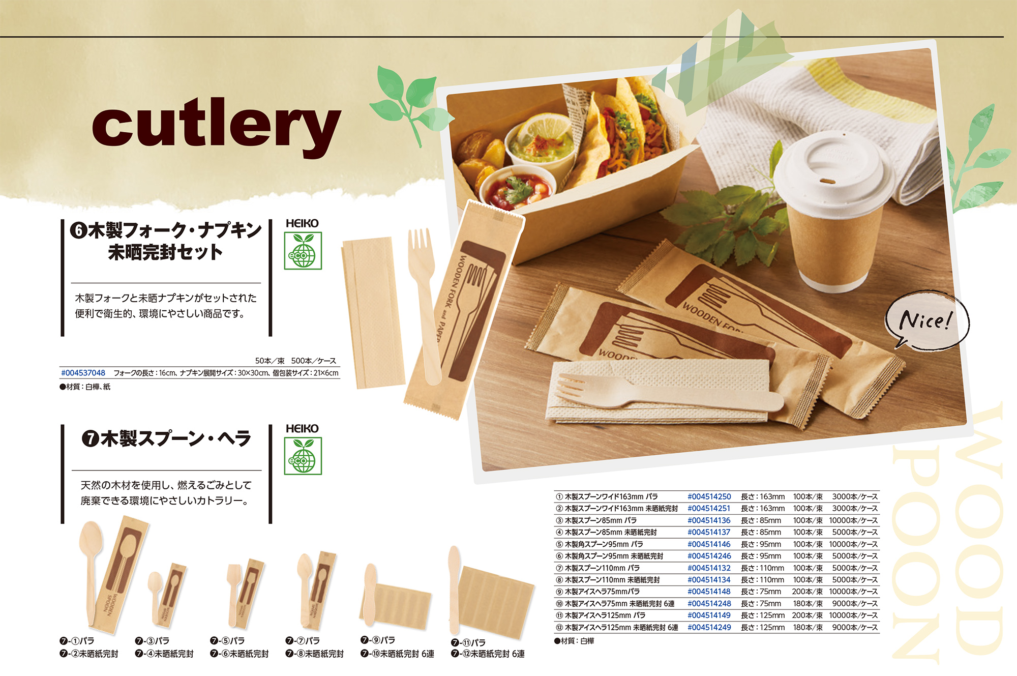 商品リスト ▼天然木材を使用、燃えるごみとして廃棄できる環境にやさしいカトラリー。