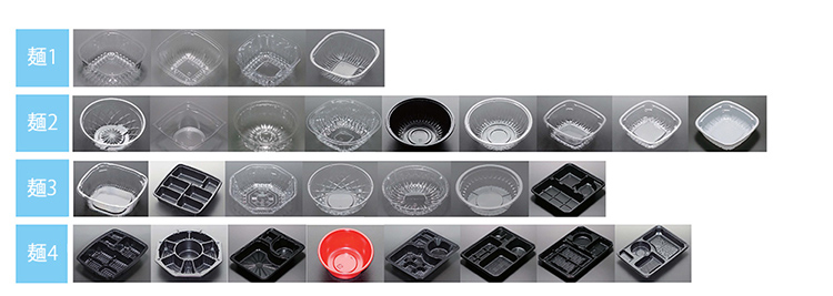 角型、丸型、中皿あり、仕切りあり等、多様な容器をラインナップしています。