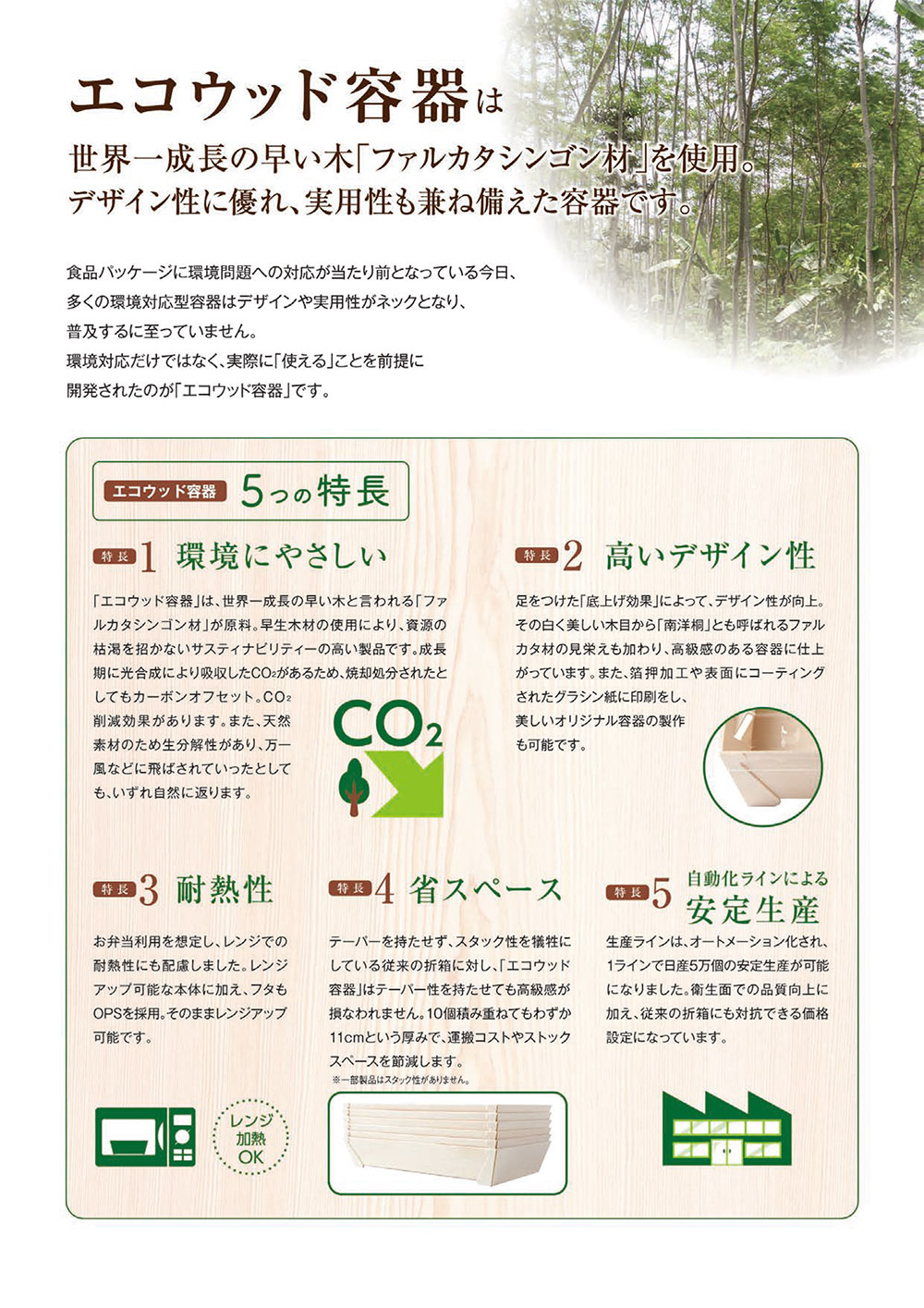 早生木材「ファルカタシゴン材」を使用した自然環境に配慮したパッケージです。 底上げ効果によってデザイン性が向上、レンジアップ可能な耐熱性も優れています。