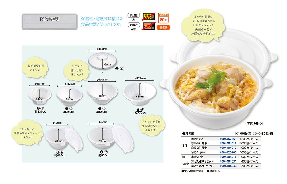 商品リスト ▼保湿性・耐熱性に優れた食品容器どんぶりです。