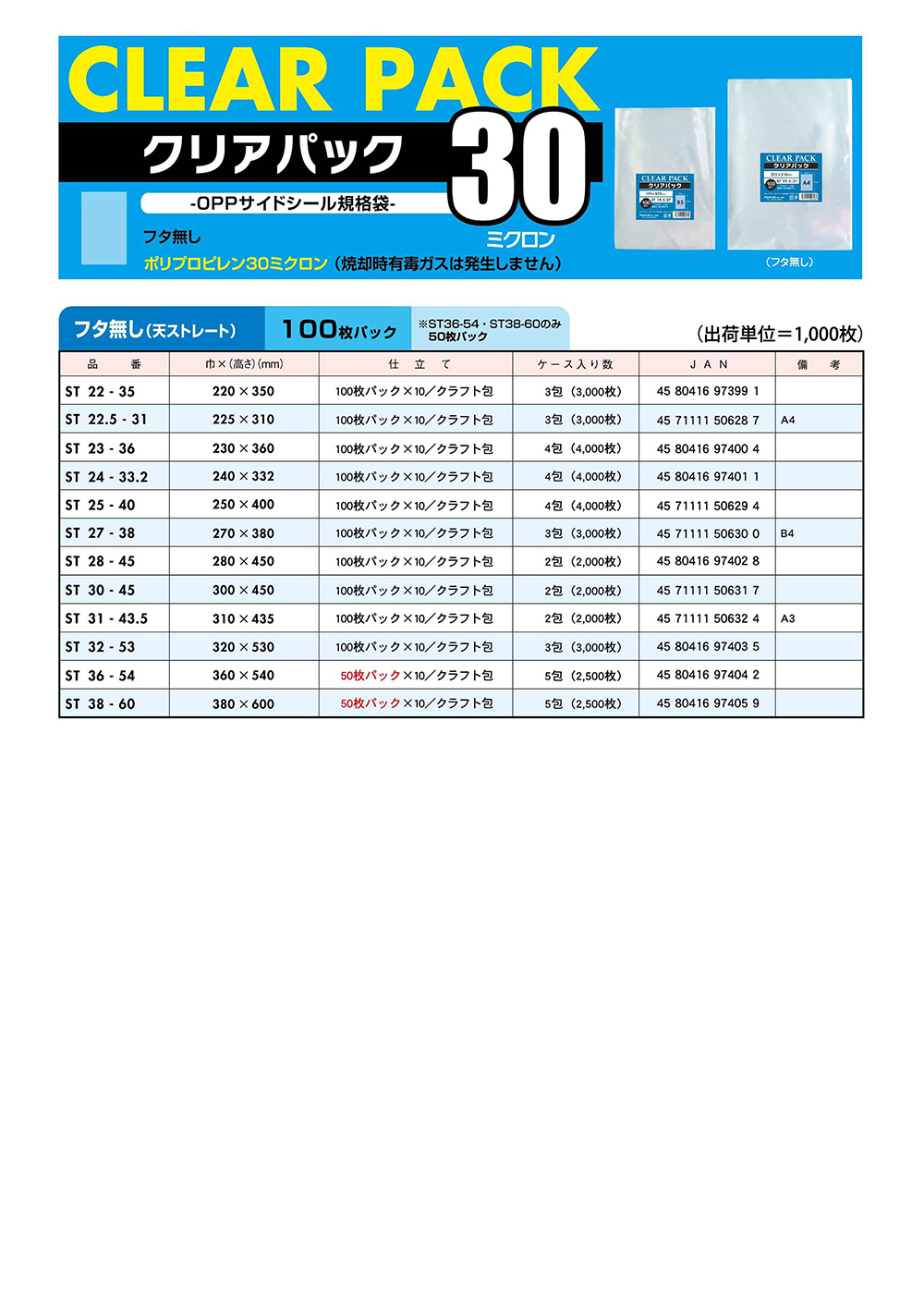 クリアパックは焼却時に有毒ガスが発生しないOPPサイドシール規格袋です。