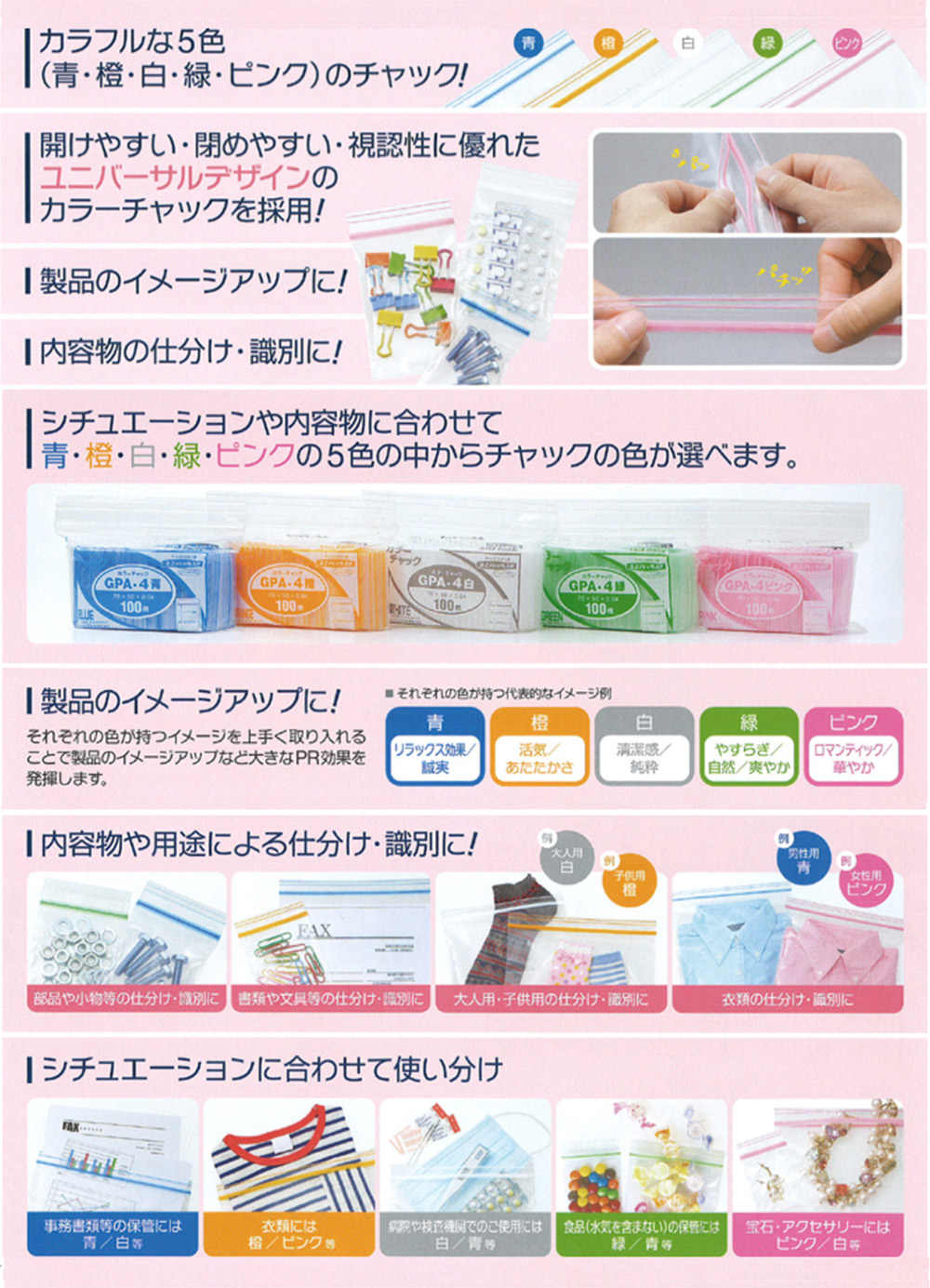 “パッ”と開いて“パチッ”と閉まる、カラフルなカラーチャックタイプです。