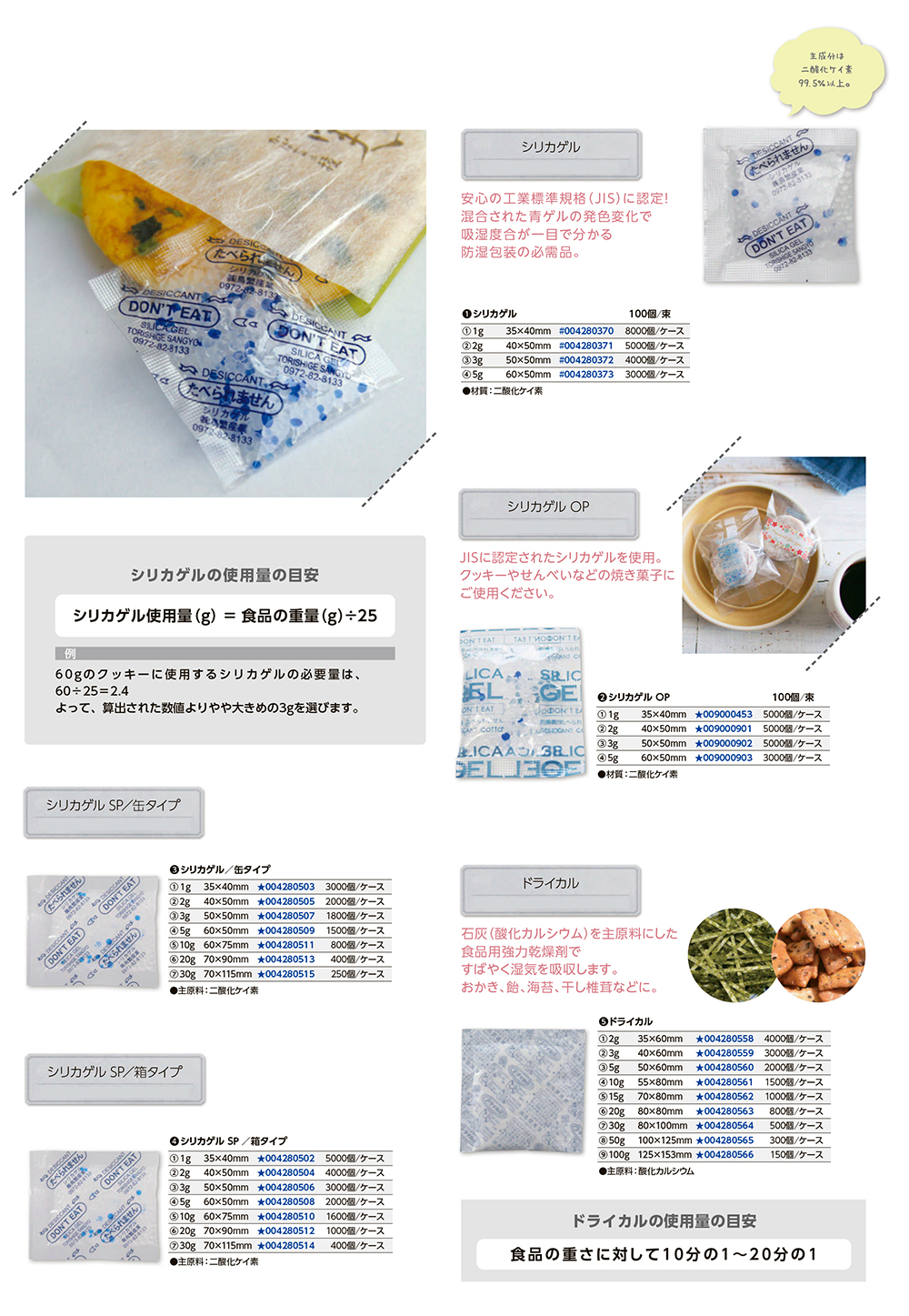 商品リスト ▼湿気を嫌う食品の保存に欠かせない乾燥剤です。